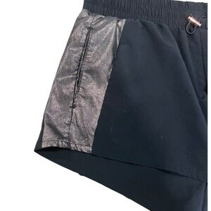 Black shorts with a bronze metallic side panel. Drawstring waist and a wide band.