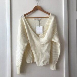 Long sleeve rib knit sweater in Ivory. V-neck collar. Overlay construction at front.