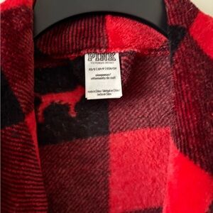 Pink brand Cozy robe with a red and black plaid design. Features a playful dog pattern.