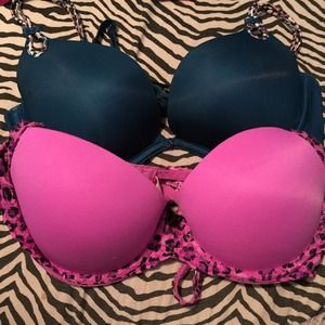 The blue is a Victoria secret bra size 34C. A little worn out but still good condition.(individual is $15) The purple cheetah is a PINK bra size 34C it's a push-up Demi. Great condition(individual $30)