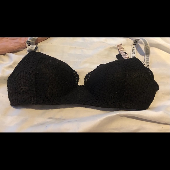 Black with lace detail, no underwire, back closure size 32DD but fits like a 34D