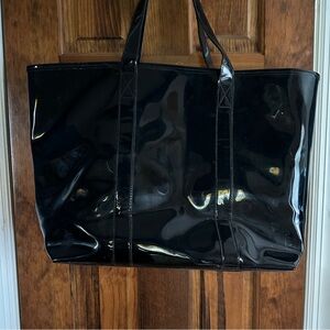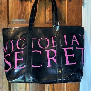 This bag is big and so beautiful! The exterior is shiny black vinyl with a glittery hot pink “Victoria’s Secret” logo. The interior is fully-lined with collages of VS models. No pockets or closures.