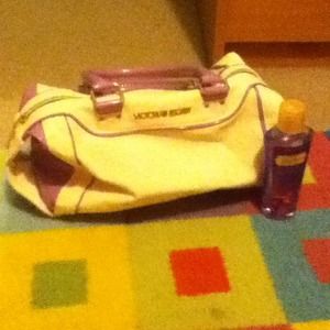 Purple and white Victoria's secret purse. With the Victoria's Secret love spell body was. Never been use.