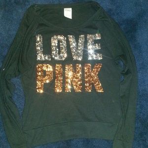Gray..going down the left leg says love pink in pink fading into orange. Then yellow then baby blue agua and last is purple. They come down to abouut your ankles, a little higher so comfortable never worn
