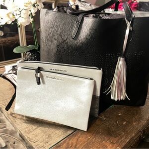 Big and nice tote . Ready for travel with two bags for makeup or accessories . This set is not new but still look like new