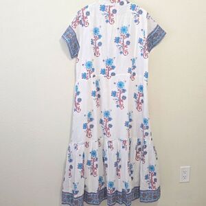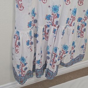 This elegant floral print dress features a beautiful combination of blue and red hues. Perfect for any occasion, it offers a stylish and comfortable fit. Great pre-owned condition. please refer to photos for more details and measurements.