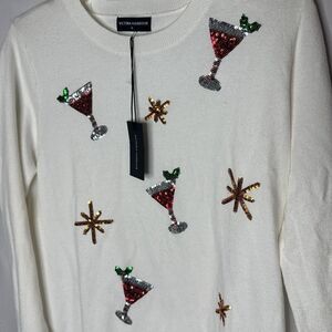 Victoria Harbour Ivory Mock Neck Sequin Martinis Holiday Sweater. Size Medium. Chic white sweater adorned with cocktail and star designs. Perfect for the holiday season! New with tag.
