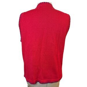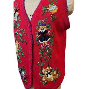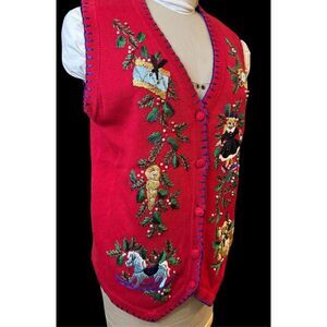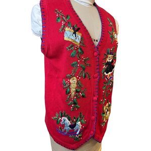 Red, sleeveless, button-front Christmas sweater vest featuring extensive embroidery and appliqués by Victoria Jones! Size M.