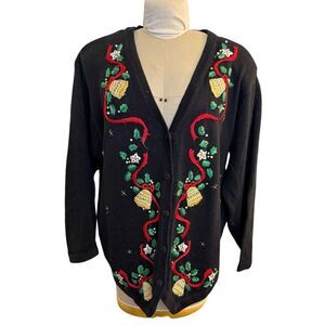 Beautiful cardigan sweater by Victoria Jones Woman, size 2XL. Christmas holiday bells themed embroidery all over front. 5 button front, V-Neck,