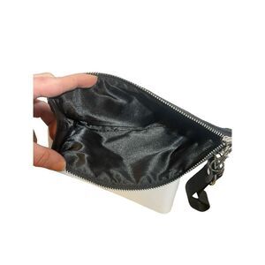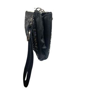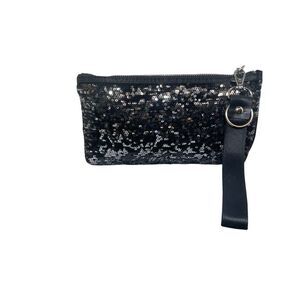 Super cute black and silver sequin wristlet also can be used as a make up bag two zippered sections for easy organization and retrieval top zip closure, satin line interior and signature logo