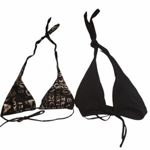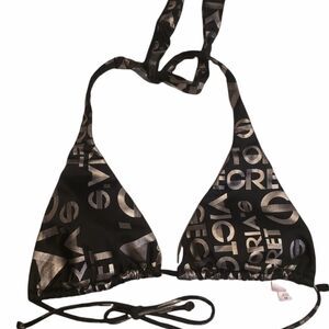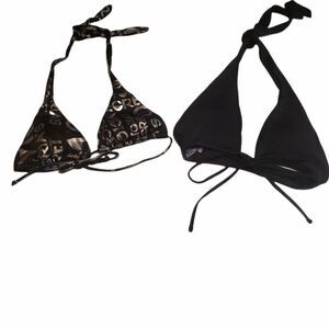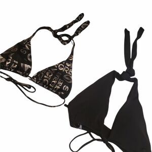 Top 1: Victoria Secret, Size Medium, Black, Great Coverage, Silver Victoria Secret Print, Removable Padding, Triangle Style, Cup Lining, Versatile, Thin Upper Straps, Tie Closure at Neck And Upper back, Gently Wear, Exellent Condition.