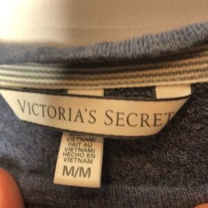 Victoria Secret Blue “Always An Angel” Sweatshirt. Size Medium. 3/4 sleeves. 44% viscose and 35% cotton. Very soft! Good used condition. Has a very small hole by the neck seam as shown in picture.