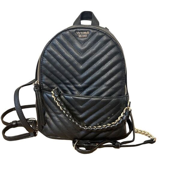 Super cute quilted mini VS backpack, gold hardware, front zip pocket with attached. Bain, top handle, zip closure, adjustable back straps with gold chain also
