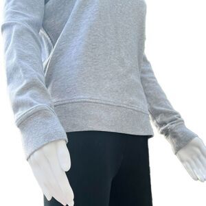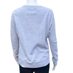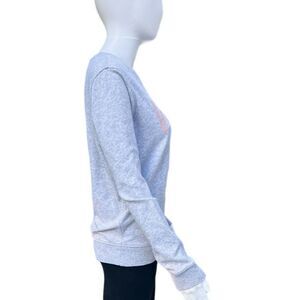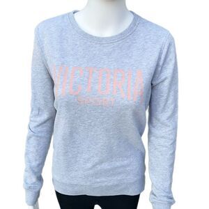 Marled grey crewneck sweatshirt by Victoria’s Secret Sport with pink “Victoria Sport” graphic logo. Has 3 small/faint stains (see last two photos), otherwise in good condition.