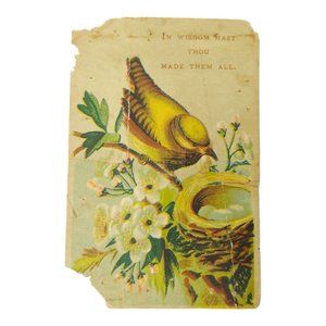 - Antique pre-owned condition. Each card shows signs of wear, age, tears, creases, age spots, yellowing (photos 1 - 10). The flower card and bird with nest has a Bible verse on it. The child with sled is by Merrell MF'G Co. and has an advertisement for employment on the back.
