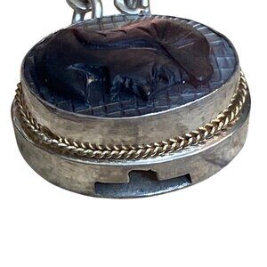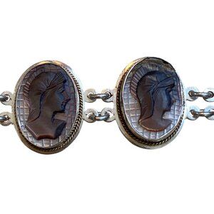 This Victorian jewelry set features intricately carved cameos on a luxurious 800 silver base. The mother of pearl adds a sophisticated touch to the design, offering a timeless elegance suitable for formal occasions or a refined addition to any collection.