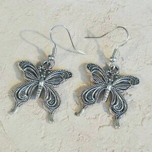 Victorian Art Nouveau Butterfly Dangle Earrings Antiqued Silver Pewter Dotted