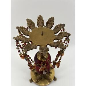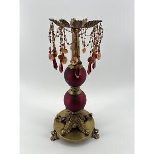 Victorian Baroque Ornate Beaded Ruby Red Glass Brass Candle Holder Prisms