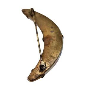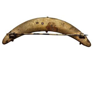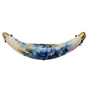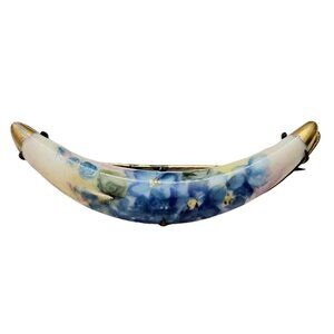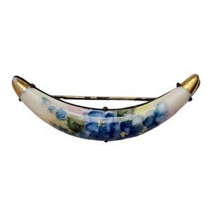This fantastic Victorian Porcelain Crescent Moon Brooch is a versatile piece of costume jewelry, it can be worn in many ways, such as adornment to a sweater, clipped to a dress, or as a hair accessory. It makes the perfect accessory to finish a great outfit and delight any costume jewelry lover and collector. The crescent moon shape is crafted from porcelain and is beautifully hand-painted with blue flowers and green leaves creating a lovely aura. The tips are highlighted with gold-tone accents. It measures approximately 2.3 inches in length. The back has a C-clasp, a long, strong metal pin that hooks under a C-shaped piece of metal to secure the attachment. This pin will beautifully complement your upcoming fashion season.