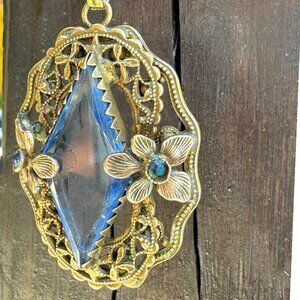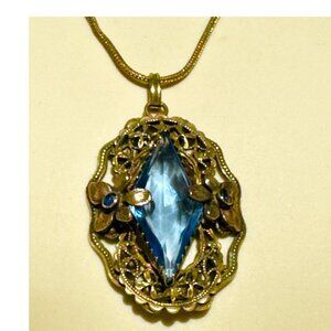 Victorian Blue Glass Diamond Shaped Filigree Pendant Necklace Gold Tone