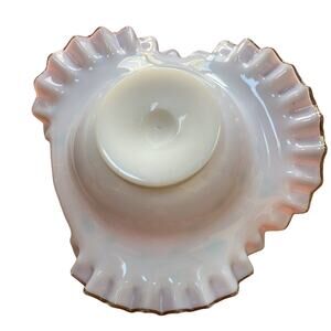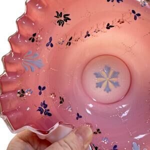 Victorian Glass Cranberry Pink & White Cased Glass Brides Basket Bowl - appears to be Bristol Glass or similar - no stand or basket included but the bowl on its own is fabulous. This gorgeous hand blown glass bowl has a unique ruffled rim and delicate hand painted enameled floral design inside the bowl. The base shows a smooth pontil mark but no other hallmarks to indicate a maker. This is a lovely bowl - the pictures don't do it justice. In excellent condition - minor shelf wear - no damage or flaws - just stunning!