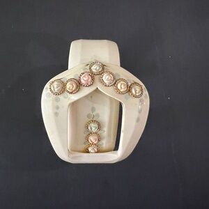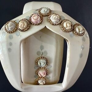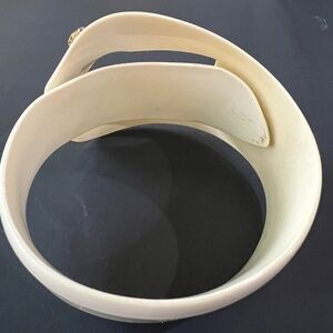 It's old Victorian era and it's made of one piece of carved white cream-tone celluloid. Buckle is decorated with small roses, surrounded by a gold ring