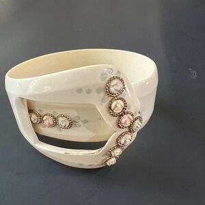 This has a buckle style with one end of the bracelet slid through the other. Along each end, are little rose-like flowers.