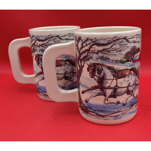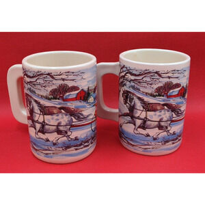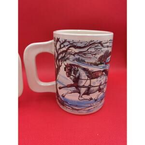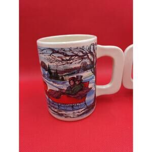 Celebrate the season with this oversized vintage ceramic mug from Houston Foods, dated 1992. The wraparound artwork features a nostalgic winter tableau: a Victorian couple riding in a horse-drawn sleigh past a red barn and snow-covered countryside. The scene spans two mugs in the original set, with this one showing the sleigh and riders in full detail.