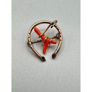Victorian Coral Horseshoe Pin Brooch Gold Filled Handcrafted Wire Wrapped Coral