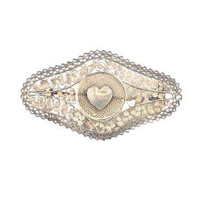 This exquisite Victorian Egyptian Revival brooch features intricate silver filigree craftsmanship with a central heart motif. Measuring 2.5 by 1.5 inches, it offers a unique blend of historical elegance and romantic charm, making it a cherished addition to any jewelry collection. Ideal for Victorian and Egyptian revival enthusiasts.
