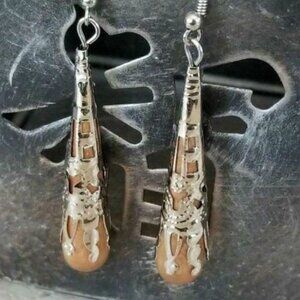 Victorian Filigree Brown Silver Wood Long Teardrop Shaped Handcrafted Earrings