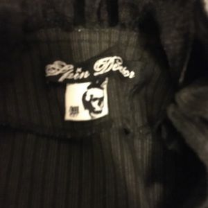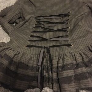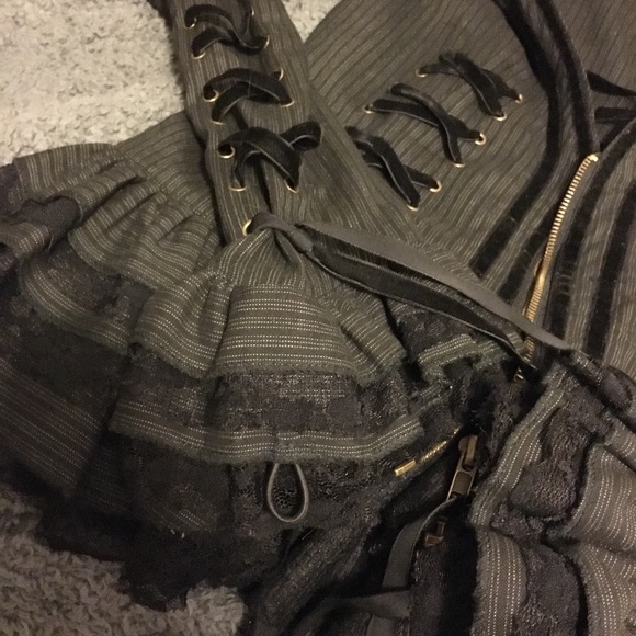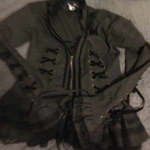 Black with lace and lace up detailing. Very slimming. Ruffles and lace up sleeves as well as lace up back. Like new! Bought at Hot Topic.