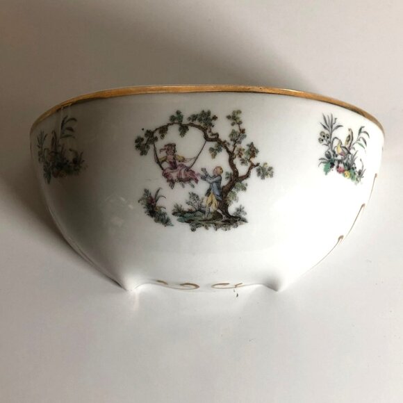 This elegant vintage wall pocket vase by Andrea is crafted from fine porcelain, featuring a charming hand-painted pastoral scene and delicate gold accents. Its classic design is ideal for adding a touch of sophistication to home decor.