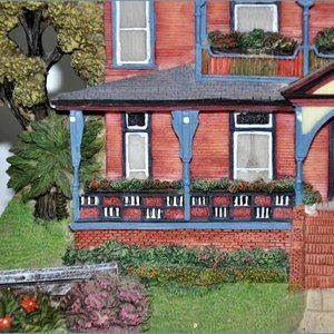 Victorian Historical Turn of the Century House for Wall Hanging, Red Brick With Wedgewood Blue Wood Trim. Each house individually cast & hand painted