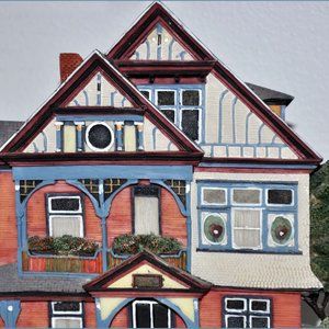 Very highly Detailed Sculpture comes with a hanger to be wall mounted and a peg so it can stand on its own. The extravagant exteriors of Queen Anne houses in America are the wonderful, final excesses of the Victorian age. Big & Bold, wild with asymmetrical design and intricate paint schemes, that demand to be noticed. Suddenly freed from older building methods by new technologies and mass manufactured components, imaginations went wild. "Less is NOT more" when it comes to Victorian Queen Anne houses and that shows in this sculptured wallhanging. Elaborate, irregular shaped rooflines and highly decorated front facing gables jut up from a corner of a house and complement a complex, multi-colored painted woodwork for these architecture driven late stage Victorian homes. Check out the detail on this beauty!.