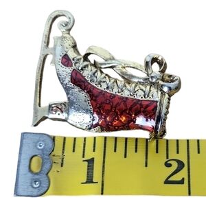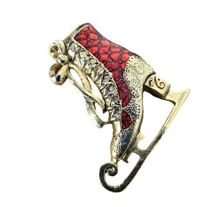 Victorian ice skate brooch featuring goldtone and red enamel. This is an unsigned piece of estate sale jewelry.