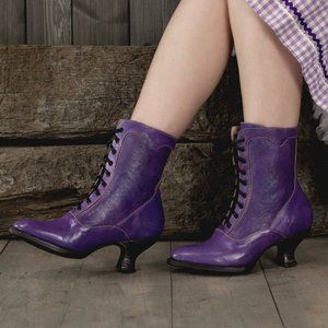 The Eleanor is a true Victorian leather short boot and are sure to attract attention. Onlookers will be envious of this hand dyed pair in Poison Rustic (rich purple). Marvel in the artistry of an embossed leather outsole. Made with a Goodyear welt outsole, and 9 hole lace up shaft this alluring beauty is sure to become a standout pair.