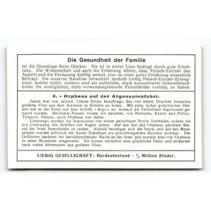 The reverse side provides a detailed German text explaining the myth of Jason and the Argonauts, highlighting Orpheus's role and emphasizing the health benefits of Liebig's concentrated beef extract products. Liebig trade cards are renowned collectibles for their artistic quality and historical advertising significance, offering a glimpse into Victorian culinary culture and mythological storytelling.