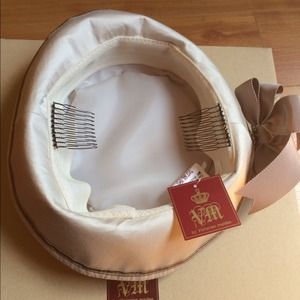 Cinnamon or beige colored sailor hat. Does not fit the whole head, it is meant to be fit to the side. Hat never worn, except for pictures. Have box that came with the hat with tags included. Detachable bow with metal inserts to place hat securely on too of your head. Well made with great materials.