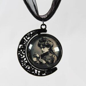 Victorian Moon Necklace – Gothic Cameo of a Fortune Teller, Black Ribbon