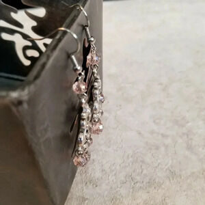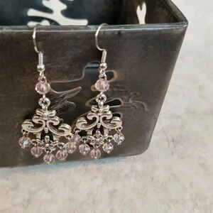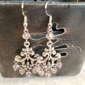 Victorian Pink Faceted Crystal Art Nouveau Silver Scroll Chandelier EarringsHandmade chandelier earringsFaceted glass crystal beads measure 6mm in diameterMeasures about 68mm long and 31mm wide overallAntiqued silver tone pewter alloy chandelier componentsSilver tone rhodium plated earring hooksPDH 405-PK 064-PK
