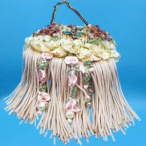 Bring timeless elegance to your holiday décor with this Victorian-style purse ornament. Adorned with delicate lace, shimmering beads, floral embroidery, and cascading fringe, it’s a unique collectible that adds vintage romance to any Christmas tree.