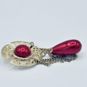 Victorian Revival Brooch Red Faux Draping Dangle Swag Chain Estate Jewelry Pin. Brooch measures 1 1/2" x 3 1/4". In good vintage condition.