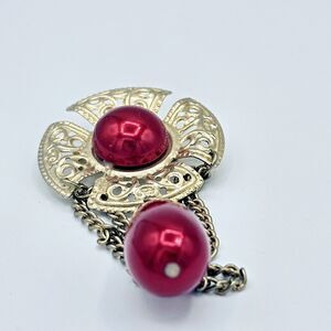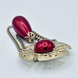 Victorian Revival Brooch Red Faux Draping Dangle Swag Chain Estate Jewelry Pin