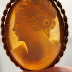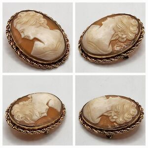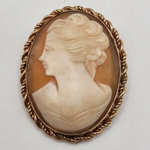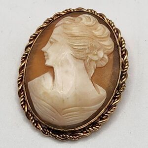 Vintage MCM Circa 1950s/1960s 12K GF Genuine Carved Shell Cameo Pendant Brooch features a stunning twisted rope edge design and is in excellent condition. Please feel free to ask questions.
