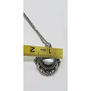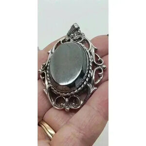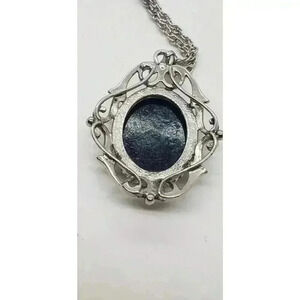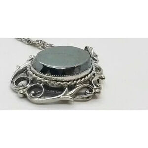 Beautiful Whiting & Davis vintage necklace featuring a large hematite colored glass pendant set in a victimization style filigree base silver toned heavy ornate chain.