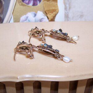 Based on a Mexican design of the late 1890s, may I offer this pair of Victorian Revival 10K Rose Gold (hallmarked as pictured), fine silver, turquoise and pearl earrings. With the central focus on the "antique" silver bird (with red stone eyes) at the center, the turquoise (glass or stone, I know not) and freshwater pearl accents lend a touch of color. The earrings are for pierced ears and are posts with omega latchbacks; the back findings help me to date the pair to the 1970s or so. The posts are slight curved at the end, this allow for a more easy access through the earlobe. Length is 1-5/8"; width is 9/16". Combined weight of the pair is 8.2 grams. Incredibly well made with no problems I can spot. (7683RV/JV#11/PB)