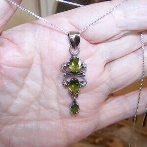 Fashioned in a Victorian Revival design, may I offer this Sterling Silver (hallmarked on bale as pictured) and faceted oval peridot (tested) drop pendant. Measuring 1-3/4" long (from top of bale to bottom drop) x 1/2" wide at the center, weight is 3.8 grams. Condition is very fine with a mellow patina to the silver. All that's needed now is the right chain, mine is for display purposes only. 7805RV/Q