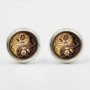 Victorian Rose Yin Yang Symbol Glass Cabochon Round Silver Plated Stud Earrings
