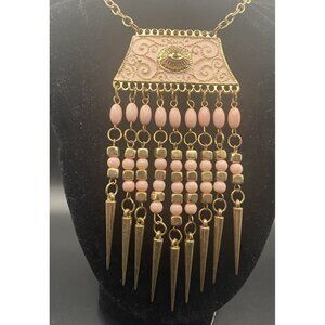 Victorian Style Bib Pink Enamel Panel Beaded Fringe Gold Tone 19" Necklace Boho